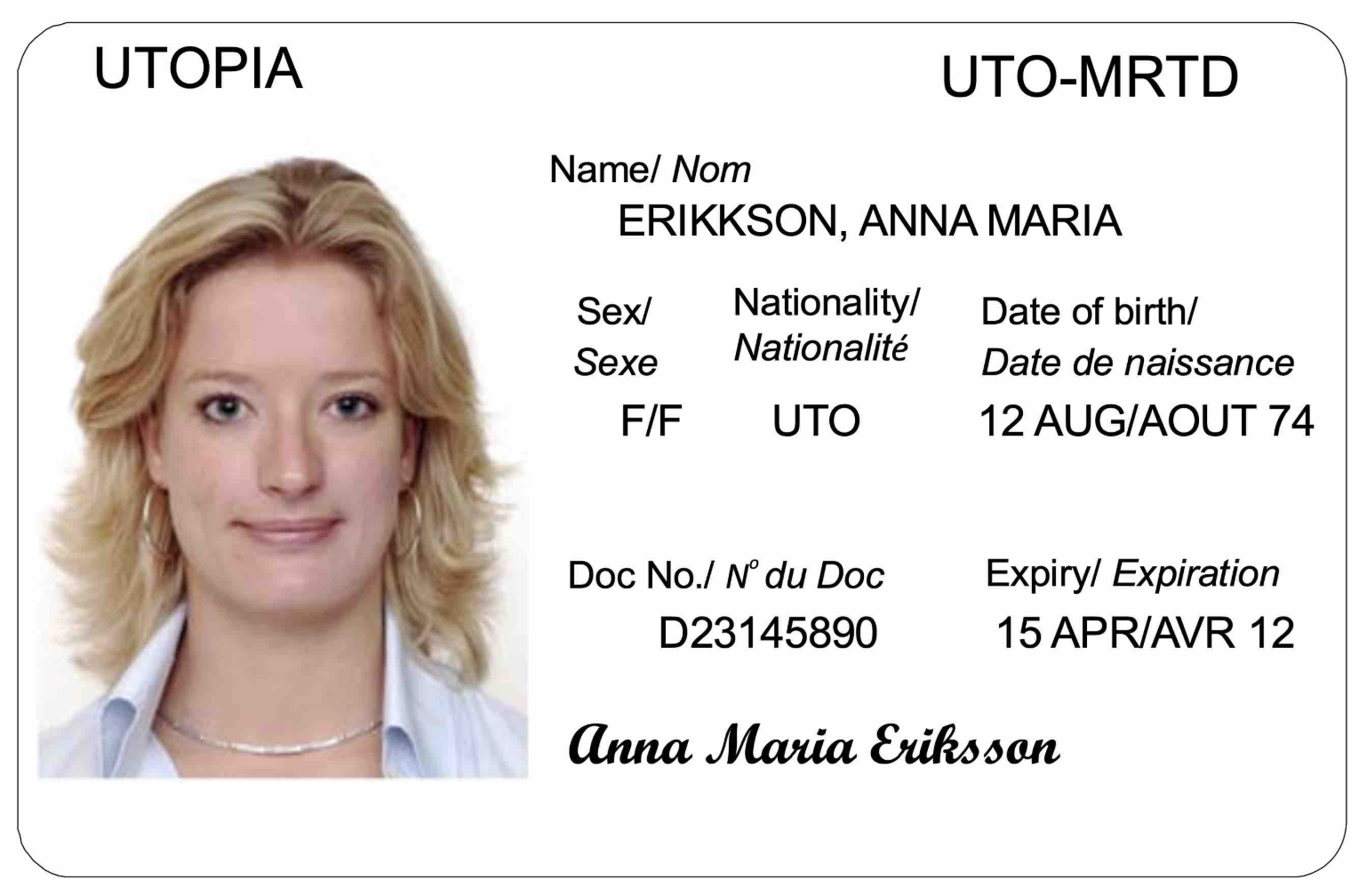 The front of a European ID Machine Readable Travel Document (MRTD) card typically adheres to the following design (from “Specifications for TD1 Size Machine Readable Official Travel Documents (MROTDs)”):