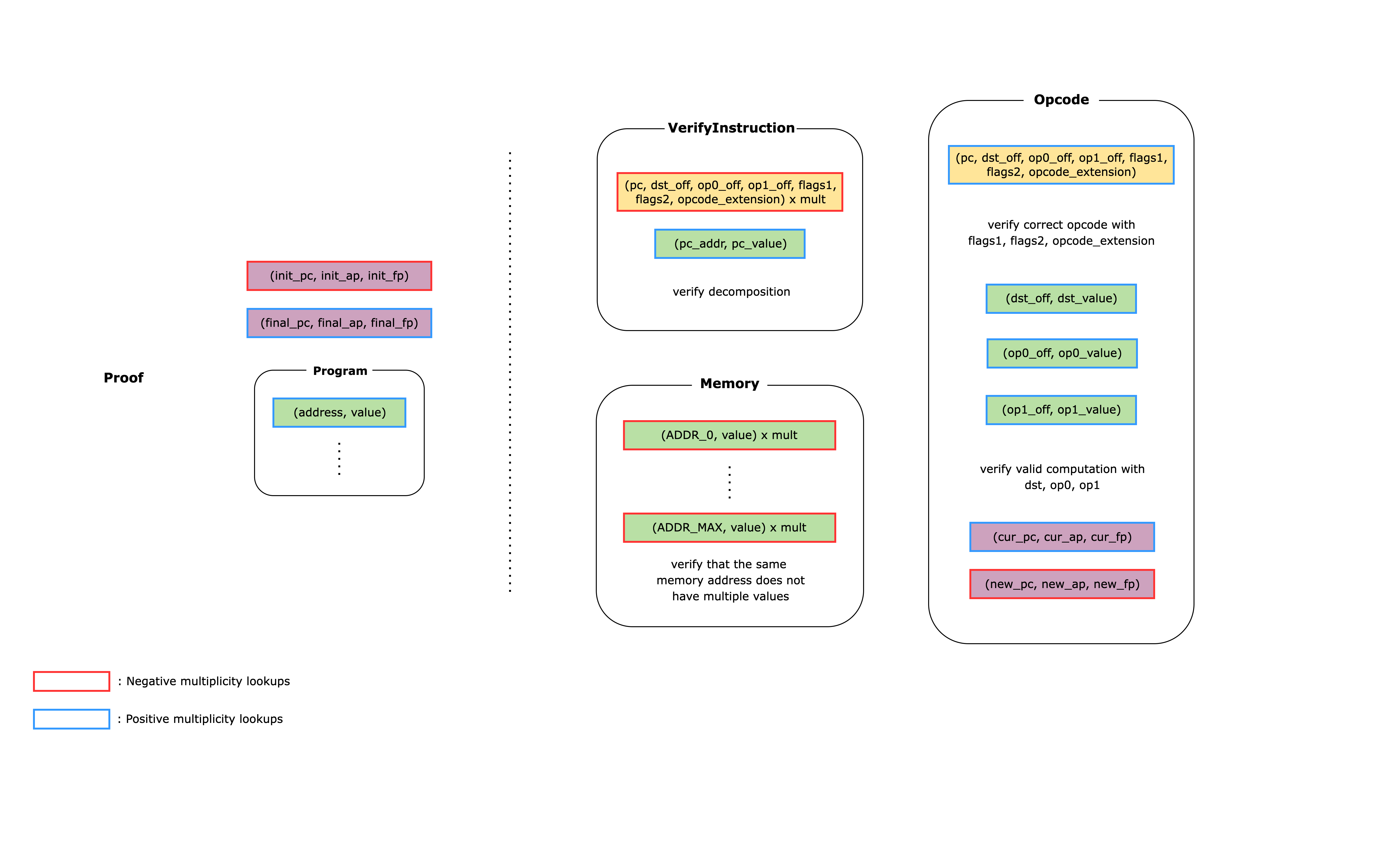 Opcodetable also updates the register values according to the flags in the instruction. This means that if we lookup the input register values for an instruction as positive and the output register values for the same instruction as negative, when adding all the lookup relations together, everything will cancel out except for the input to the first instruction and the output of the last instruction. Since these register values are public to the verifier, the verifier can simply subtract(init_pc, init_ap, init_fp)and add(final_pc, final_ap, final_fp)to the total claimed sum and check that it equals zero. - To check the validity of the read-only memory, we need to check that each memory address does not map to multiple values. To do this, the