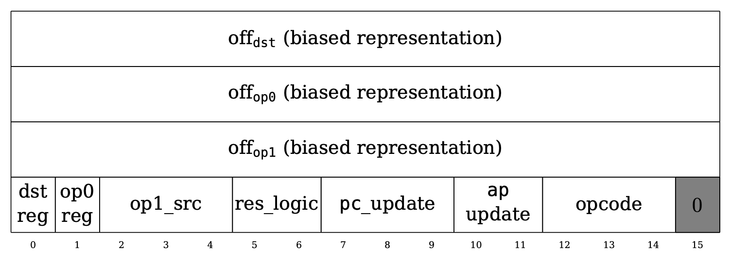 To give a brief introduction to CairoVM, the CairoVM contains a read-only memory and a CPU with 3 registers (pc, ap, fp) that executes a single Cairo instruction every step. As can be seen in the figure below, a Cairo instruction is composed of 64 bits, where the first 3 16-bits represent the offsets to the 3 operands (dst, op0, op1) that the instruction uses.